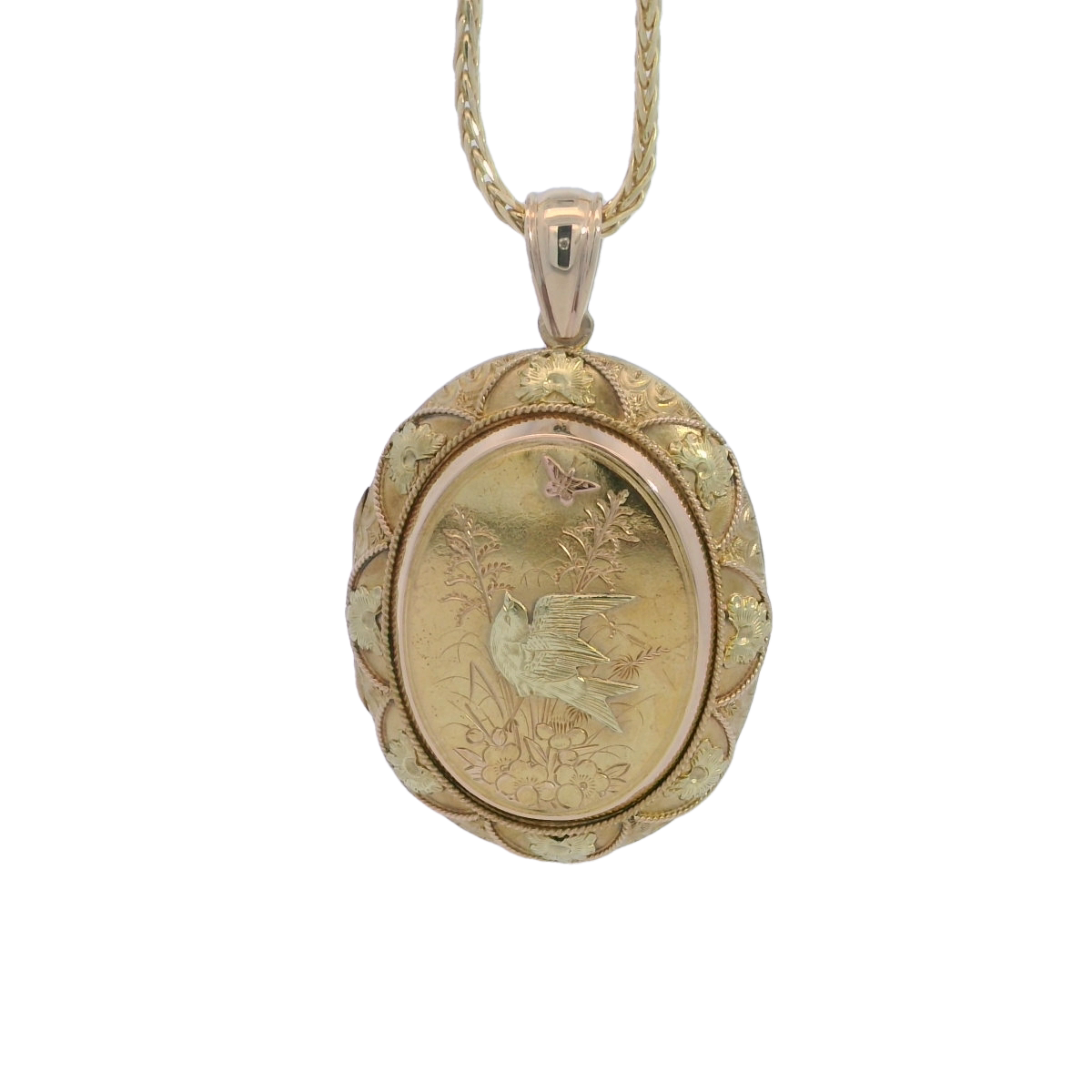 A beautifully decorated vintage locket, the front is crafted from 18ct gold, exhibiting a polished finish with intricate decoration. The light green golden bird is set amidst engraved floral motifs, complemented by a rose gold butterfly. The locket is framed by a two toned decorative border with a scalloped edge. The bail is not original but featuring a smooth, rounded profile. The back of the locket shows a polished finish and is made in 13ct yellow gold. The overall construction indicates a high level of artistry and attention to detail, typical of vintage or antique jewellery pieces.