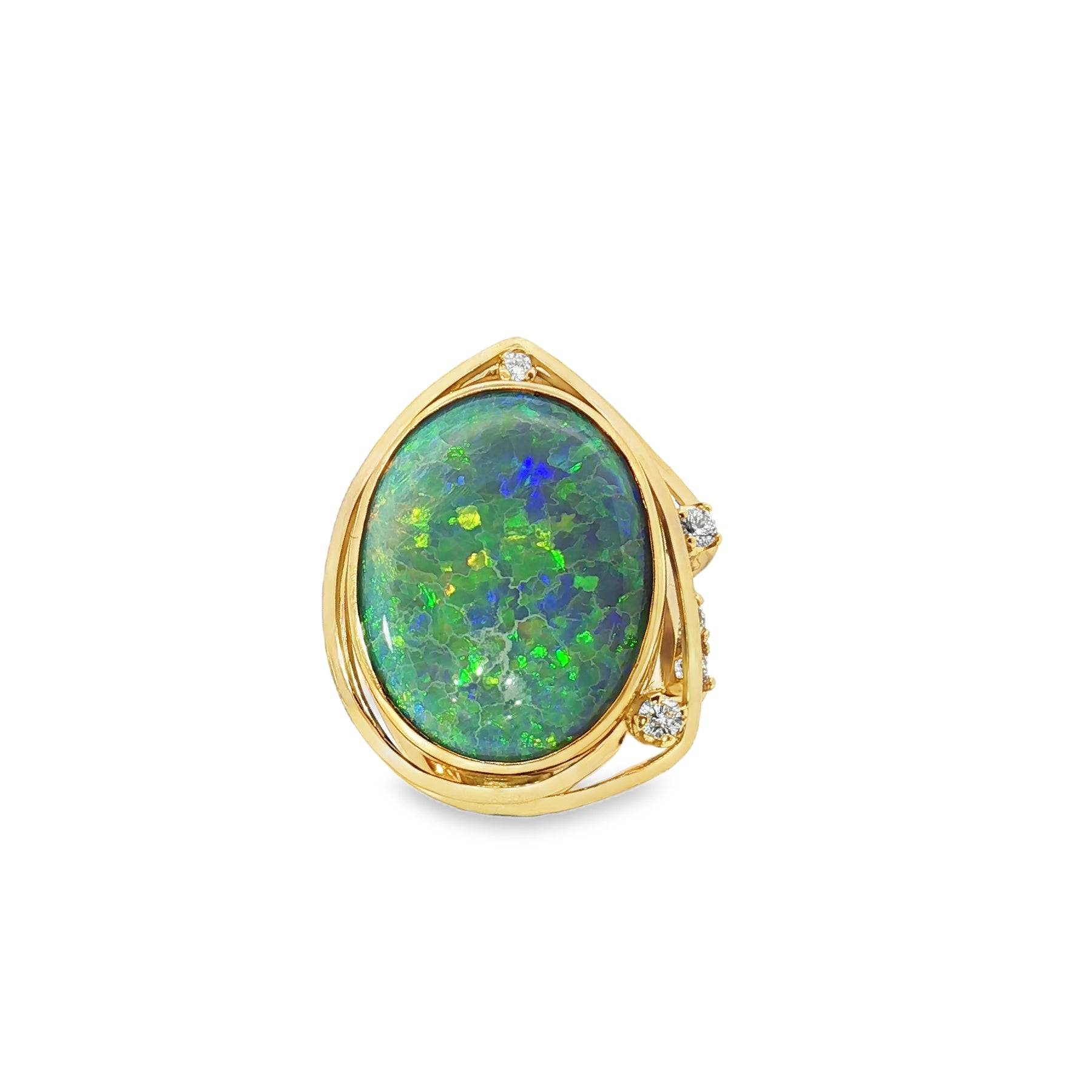 Indulge in the allure of this exquisite cocktail ring, featuring a mesmerizing oval cabochon-cut opal. The vibrant green play-of-color dances across the gemstone's surface, set in a lustrous yellow gold mounting. A bold statement piece that captures the eye, it exudes sophistication and charm. Opal: Lightening Ridge Approx 10-15ct 24.38mm x 19.5mm Diamonds: 5 Round Brilliant Cut Total Weight .41ct G Si1 Finger Size: N1/2 Total Weight: 26.74 grams